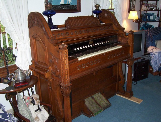 Just what I need - another project! This is a Farrand reed organ, chapel model. It has 15 stops and plays well, but could use a little work. The Golden Oak woodwork is in excellent condition, and is beautiful! The keyboard is perfect. The price was right, and they delivered it!.