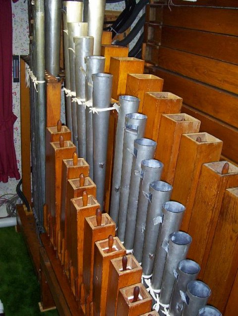 August: All the offset pipes are now in place. Left to right: Salicional, Tibia, Trumpet, Tibia, Flute (hidden), and Bourdon 16'.