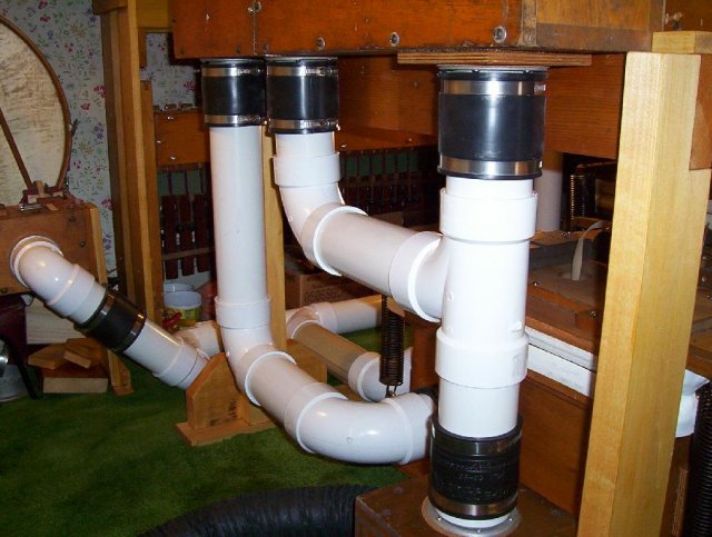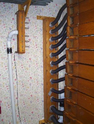 Under the main chest, showing galvanized wind line from blower, 4" line to 3 ranks of main, and 3" lines to 1 rank of main and Sal and Bourdon offsets.