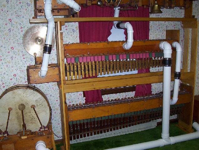 My first attempt at building support framing. This frees up some floor space to make working on the main chests easier, and gives my cat a new "jungle gym" to climb all over! It's not every pipe chamber that has curtains, wallpaper, and carpet! This finishes the percussions. Now "the drums go bang and the cymbals clang"!