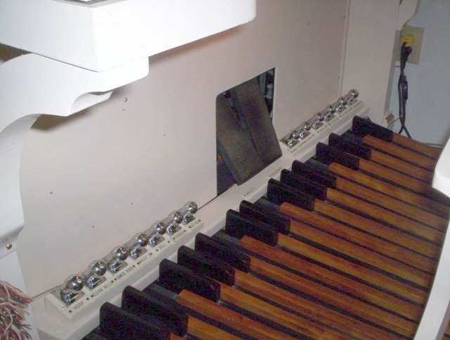 Main chest. Ranks, left to right: Vox Humana, Tibia, Flute, Salicional, and Trumpet.